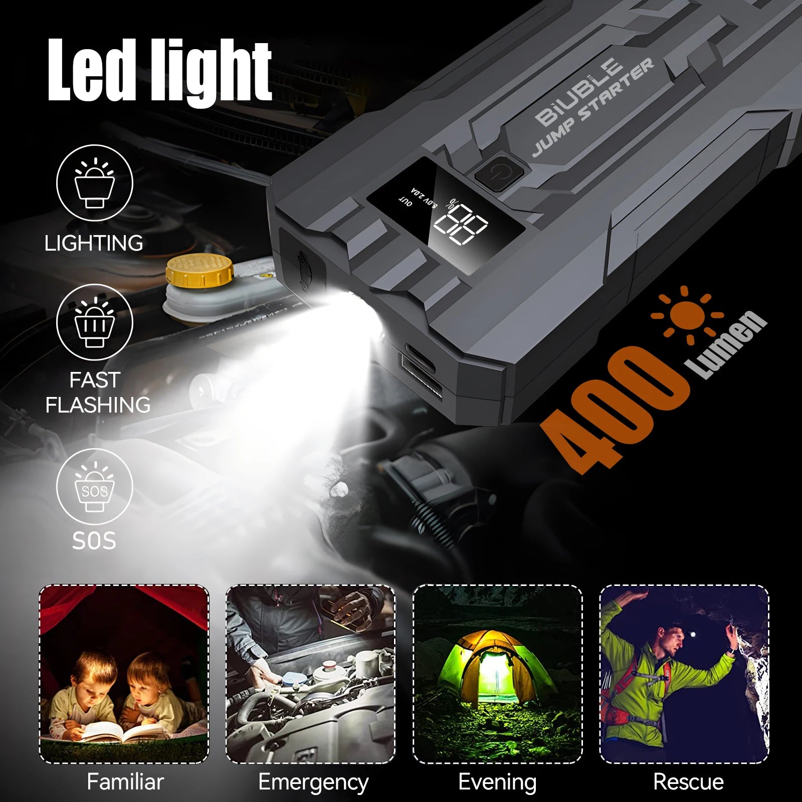 Die Biuble Auto Starthilfe 3000A Spitze 25000mAh ist ein kraftvoller und zuverlässiger 12V Batterie Booster, der Fahrzeuge in Sekundenschnelle startet. Mit einer extremen Spitzenleistung von bis zu 3000A eignet sich dieser Jump Starter ideal für PKW, SUVs, Motorräder, Wohnmobile, Boote und viele weitere 12V-Fahrzeuge.