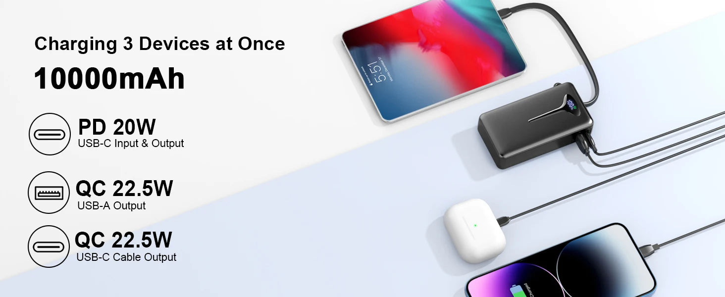 Power Bank FastCharging 10000mAh 22.5W USB-C In Out ,Built-in Cable For IPhone ,Android